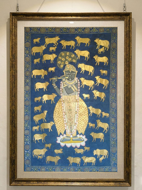 Lord Krishna was born in the city of Mathura and spent his childhood in Vrindavan. Childhood tales fill Krishna's story with mischief and miracles. Many Laddu Gopal images show him as a crawling baby holding butter in his hand and a smiling, innocent child. Many Devotees worship Laddu Gopal not as a god but as their own family member. To bring the blessings of Laddu Gopal into your home, explore our beautiful collection of Shrinathji Pichwai paintings at Cottage9.